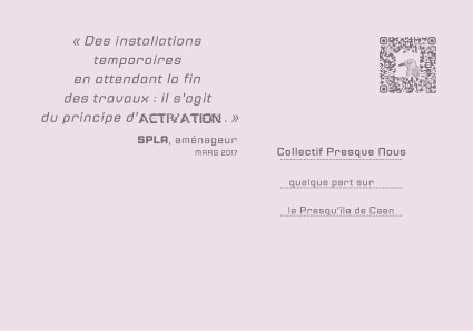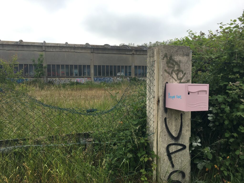 Dix boîtes aux lettres récupérées avant destruction d’un bâtiment emblématique de la Presqu’Île. Repeintes aux couleurs de Presque Nous et parsemées sur le territoire , elles symbolisent notre présence mouvante et précaires. Les jours de la restitution elles sont devenues réceptacles d’une correspondance éphémère.