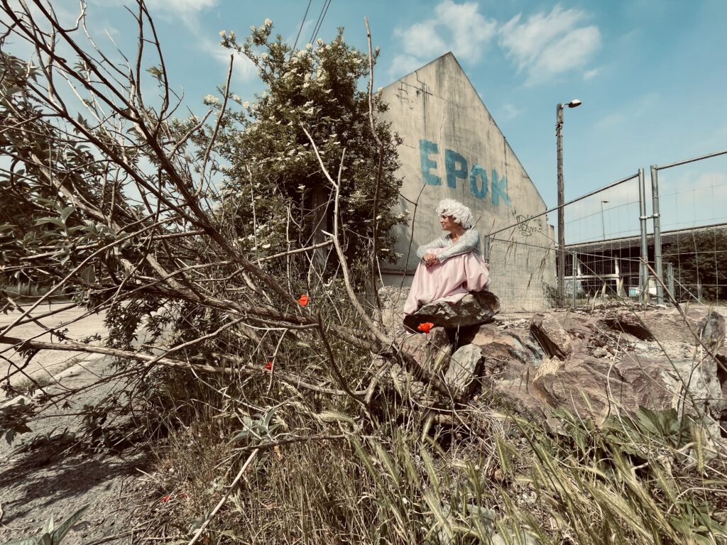 A travers les saisons, Syssy Précaire Impératrice, personnage né du confinement, en apparence d’une autre époque avec sa robe sequins d’un rose suranné et sa perruque Louis XIV, évolue dans ce décor, complètement inscrite dans un quotidien banal.